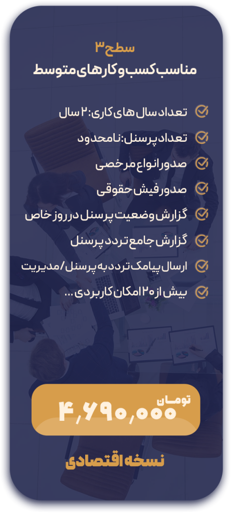 نسخه سطح سه نرم افزار حضور و غیاب نوین پرداز عموما برای مشاغل متوسط با حداکثر 20 پرسنل طراحی شده است. این نسخه از نرم افزار نسبت به نسخه های سطح یک و سطح دو که به نسبت امکانات پایه ای کمتری را دارند ، تفاوتهای بسیاری دارد. در این نسخه تعداد سالهای کاری و یا شرکتهایی که می توان تعریف کرد به عدد2 افزایش یافته است. همچنین تعداد کاربران نرم افزار به 2 کاربر و تعداد دستگاه های حضور و غیاب قابل تعریف در نرم افزار که بتوان آنها را مدیریت کرد به دو دستگاه ارتقا یافته است . برای ثبت و مدیریت تردد حداکثر 20 پرسنل ، می توان تعداد 5 شیفت کاری را تعریف و به پرسنل اختصاص داد. پشتیبان گیری اتوماتیک و دستی ، پشتیبانی از تقویم شمسی (مشاهده مناسبت ها و تعطیلات رسمی)، امکان گزارش کامل تردد پرسنل بصورت ماهانه ( مشاهده ریز تردد پرسنل به همراه مقایسه با شیف کاری و محاسبه کسر کار و اضافه کار) ، امکان دریافت ترددهای پرسنل از دستگاه حضور و غیاب توسط حافظه جانبی (فلش) جهت ارتباط آفلاین ، تعریف قرارداد کاری (نوع کارکرد، اضافه کار، کسرکار، مرخصی) از جمله امکانات عمومی نسخه سطح سه نرم افزار حضور و غیاب می باشد.